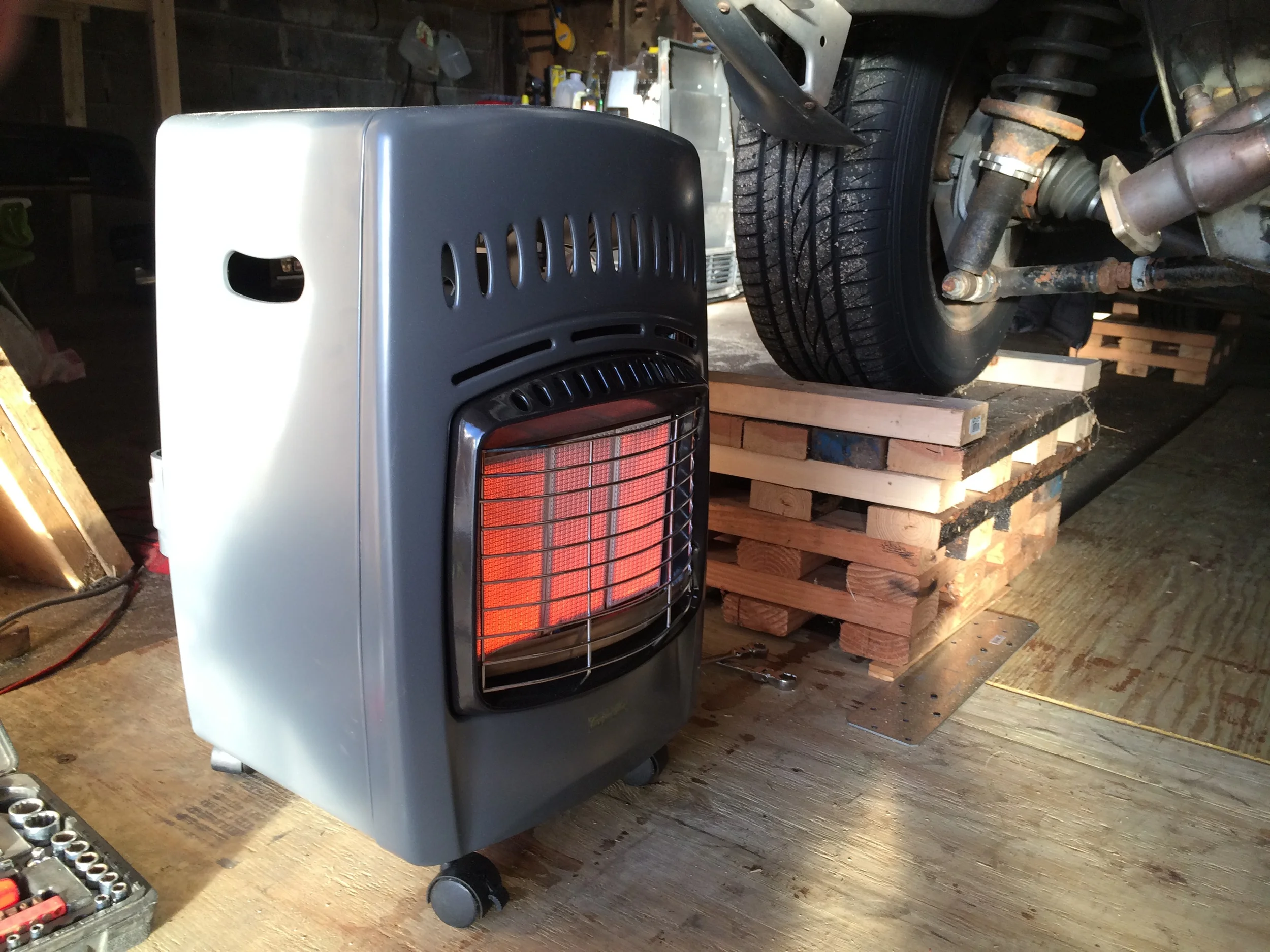 Update: I have brought an old electric heater to the garage from home as well. This is useful when I'm not using power tools and thus don't have to worry about overloading the circuit. It also saves me from dragging the propane heater home and back and dealing with the pilot blowing out or its somewhat finicky ignition.