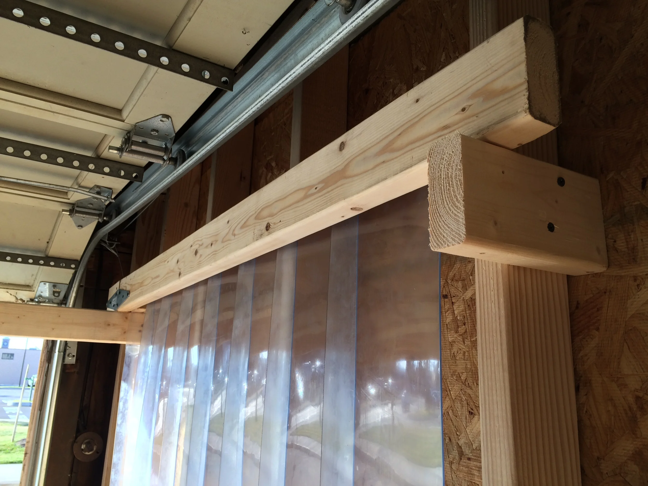 I wanted the curtains to go as high as possible and thus be as close to the top of the door as possible. I made sure to first roughly mount the header, and then tried to close the door to make sure there was enough clearance. This was important as the distance between the garage door and the header change as the panels of the door rotate along the rail. In the final setup, the garage door just clears the header when the curtain "doors" are open, but will hit the curtain "door" if they are closed, or when attempting to close the garage door while the curtain is in place. I don't have a problem with this, since it's easy enough to open the doors before leaving for the day.