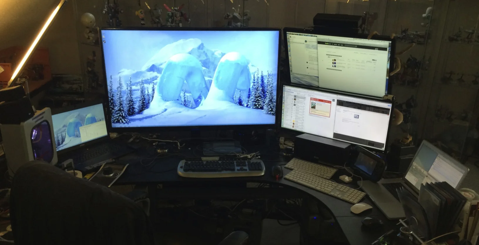 Another advantage of the curved screen is that while the speakers are still sunk under the desk, it isn't flush with the back of the desk so the sound is less muffled. I've considered raising the shelf a bit so that the edge of TV sits on the top of the desk, but I haven't actually done that just yet. They're still TV speakers, so they're not going to sound great, but they're better then the Seiki.